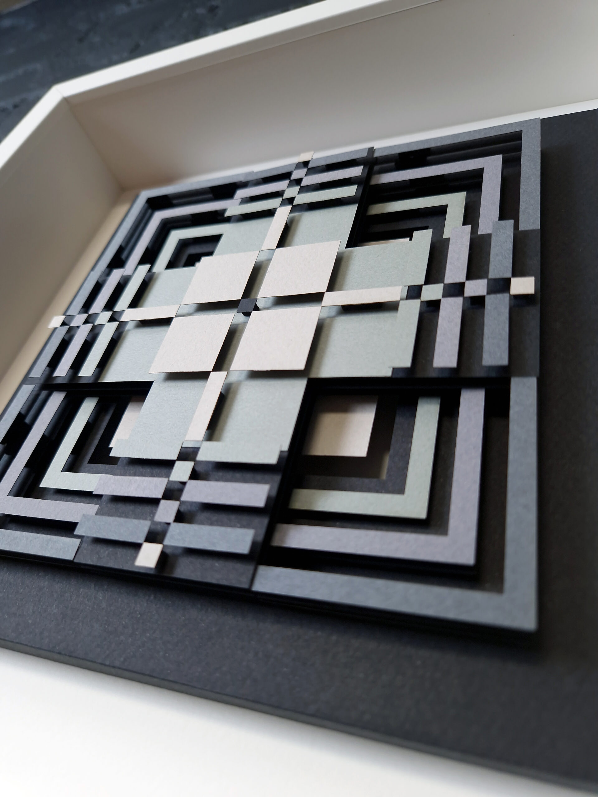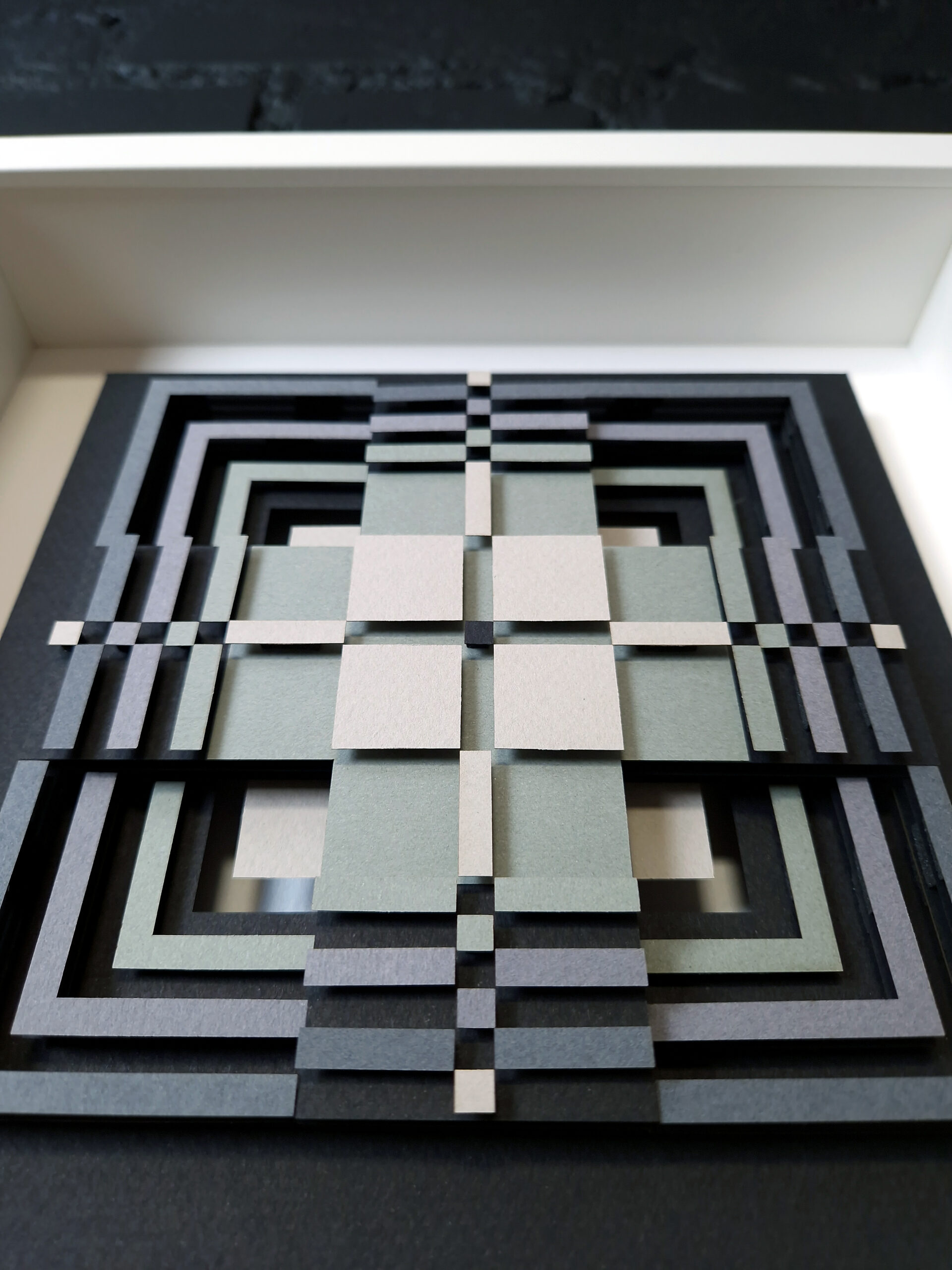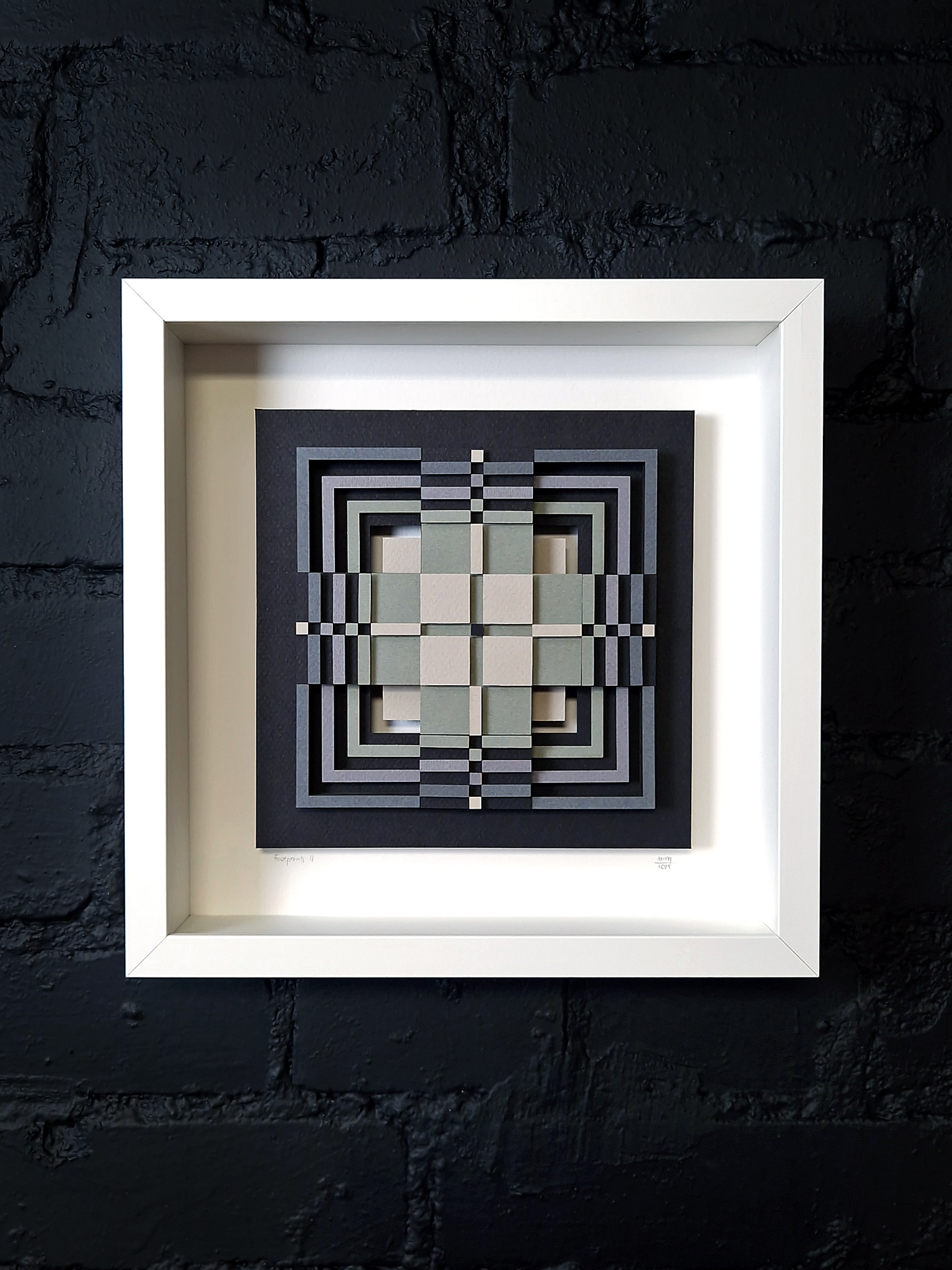 Add a touch of depth, structure, and modern elegance to your space with this handcrafted paper relief “Footprints II” — artwork inspired by traditional Lithuanian pattern. Each element is cut, layered, and assembled to create a three-dimensional geometric composition. The artwork features a palette of soft greys, muted greens, and charcoal tones arranged in symmetrical, interlocking lines. The depth created by the layered construction gives the piece a sculptural quality that feels both modern and meditative.