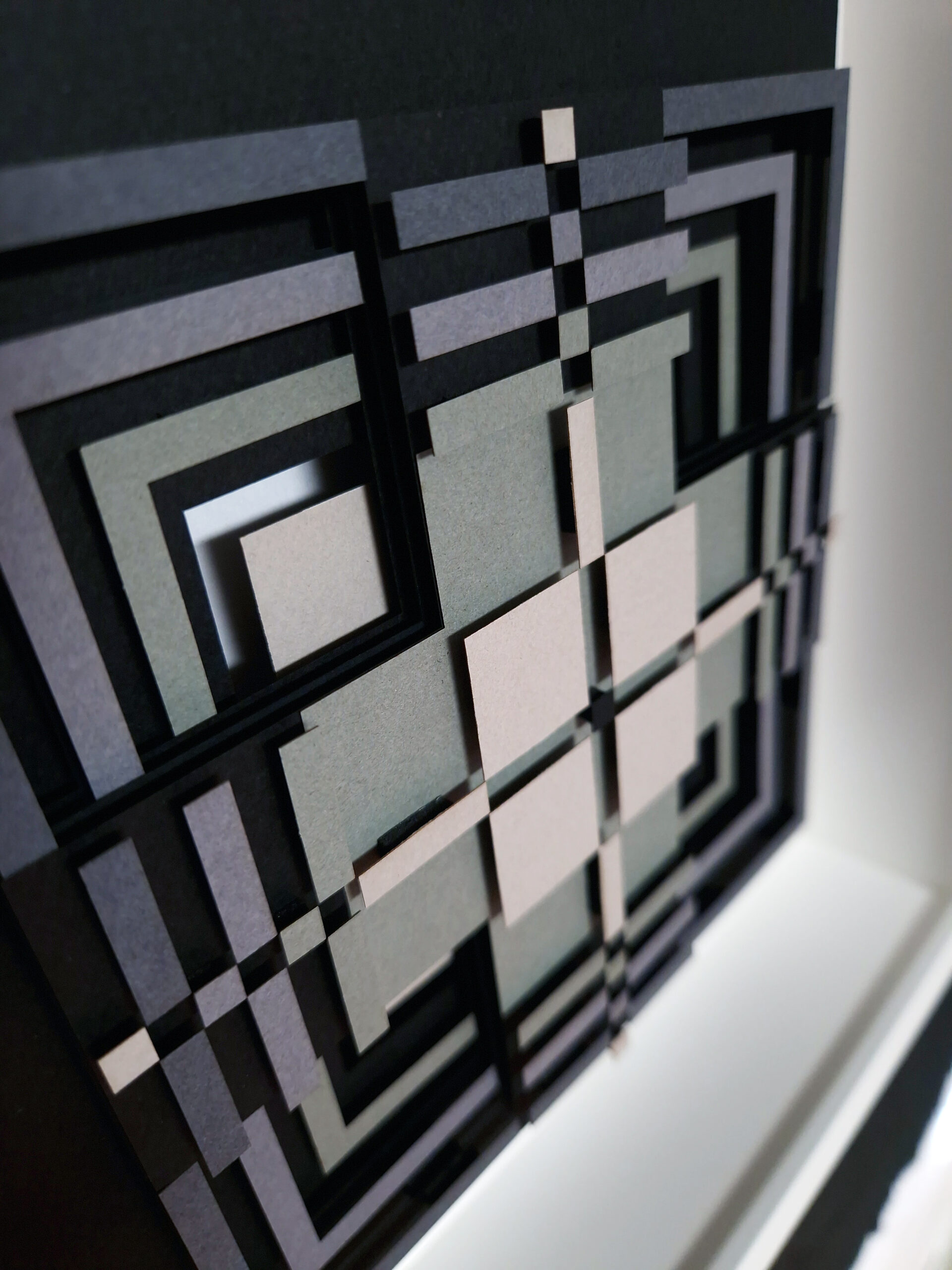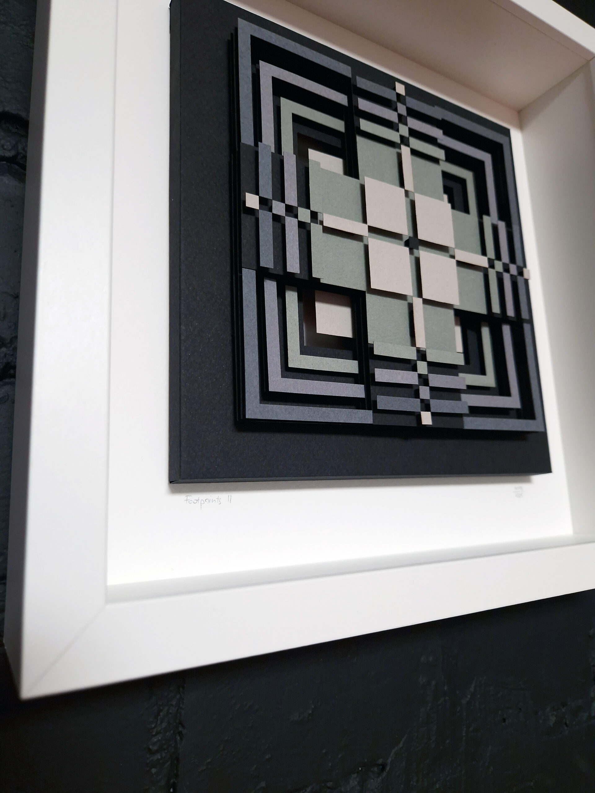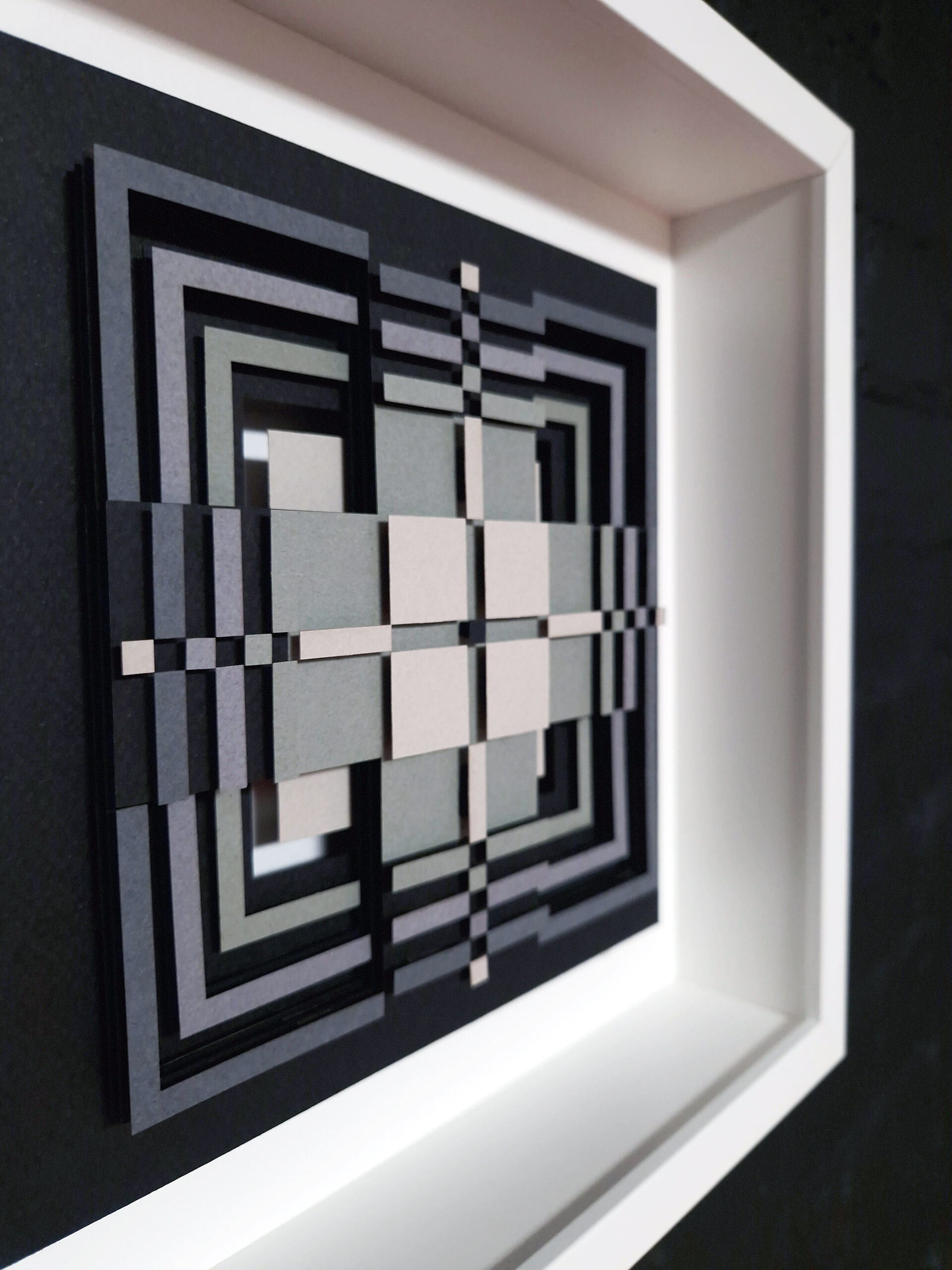 Add a touch of depth, structure, and modern elegance to your space with this handcrafted paper relief “Footprints II” — artwork inspired by traditional Lithuanian pattern. Each element is cut, layered, and assembled to create a three-dimensional geometric composition. The artwork features a palette of soft greys, muted greens, and charcoal tones arranged in symmetrical, interlocking lines. The depth created by the layered construction gives the piece a sculptural quality that feels both modern and meditative.